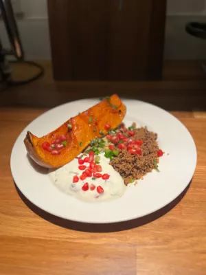 Potimarron rôti, céréales et chèvre frais