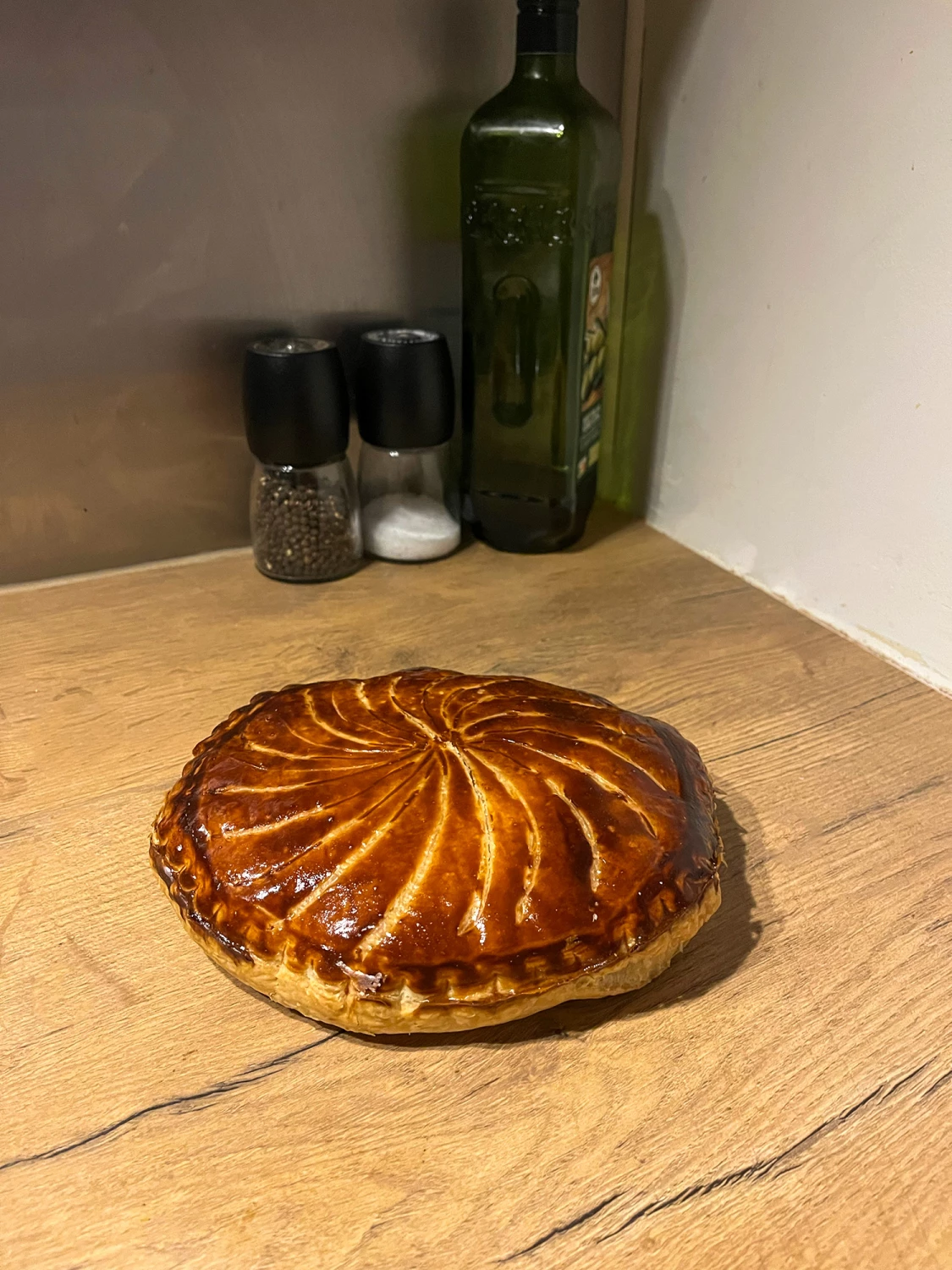 Étaler la première pâte feuilletée en forme de cercle et la disposer sur un lèche frites. Etaler délicatement la crème frangipane au centre de la pâte, en laissant un bord d'au moins 1,5 cm sur les côtés. Ne pas oublier de mettre la fève.
