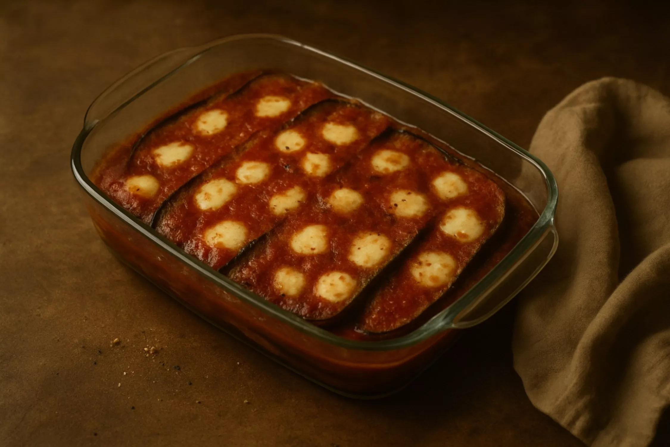 Passez au montage. Dans un plat à gratin, étalez une fine couche de sauce, puis accolez les aubergines dans le plat. Les aubergines ne doivent pas se superposer. Ces deux couches constituent la base de la parmigiana.